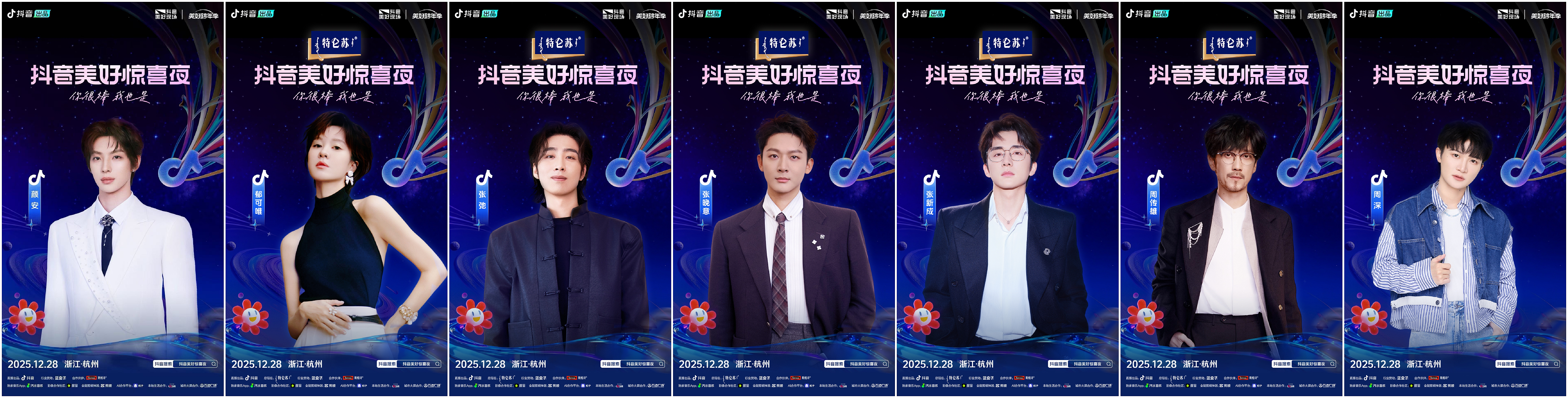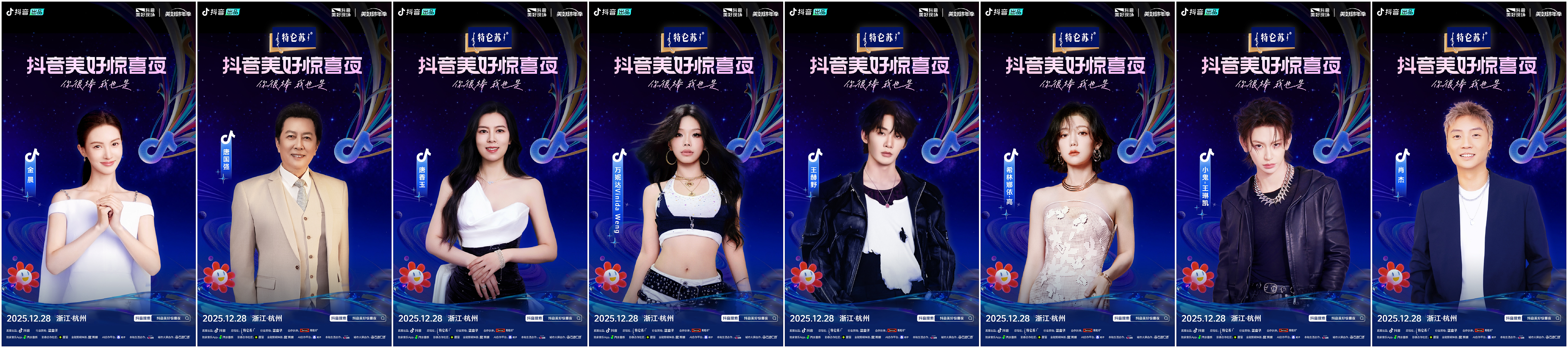 本次「2025抖音美好惊喜夜」携手齐思钧、汪聪、锤娜丽莎、黄誉博、黄子弘凡、胡夏、蒋敦豪、蒋龙、金晨、唐香玉、王赫野、万妮达Vinida Weng、小鬼-王琳凯、肖杰、希林娜依·高、颜安、郁可唯、张弛、张晚意、张新成、唐国强、周传雄、周深;以及站内优质创作者:@宸荨樱桃、@昊艺星城、@亮司、@琳园长、@王不染、@川剧·吴菁菁、@以沫MOMO、@村里的廿、@OWEN欧阳子文、@外卖梁、@野生大伢、@天使童声合唱团、@杭州青年合唱团、@桃李春风合唱团;更有星星人、小汽水、扣子Coze、小火人和ta的朋友们、醒图、智元灵犀X2等惊喜嘉宾现身,共同献上精彩舞台。